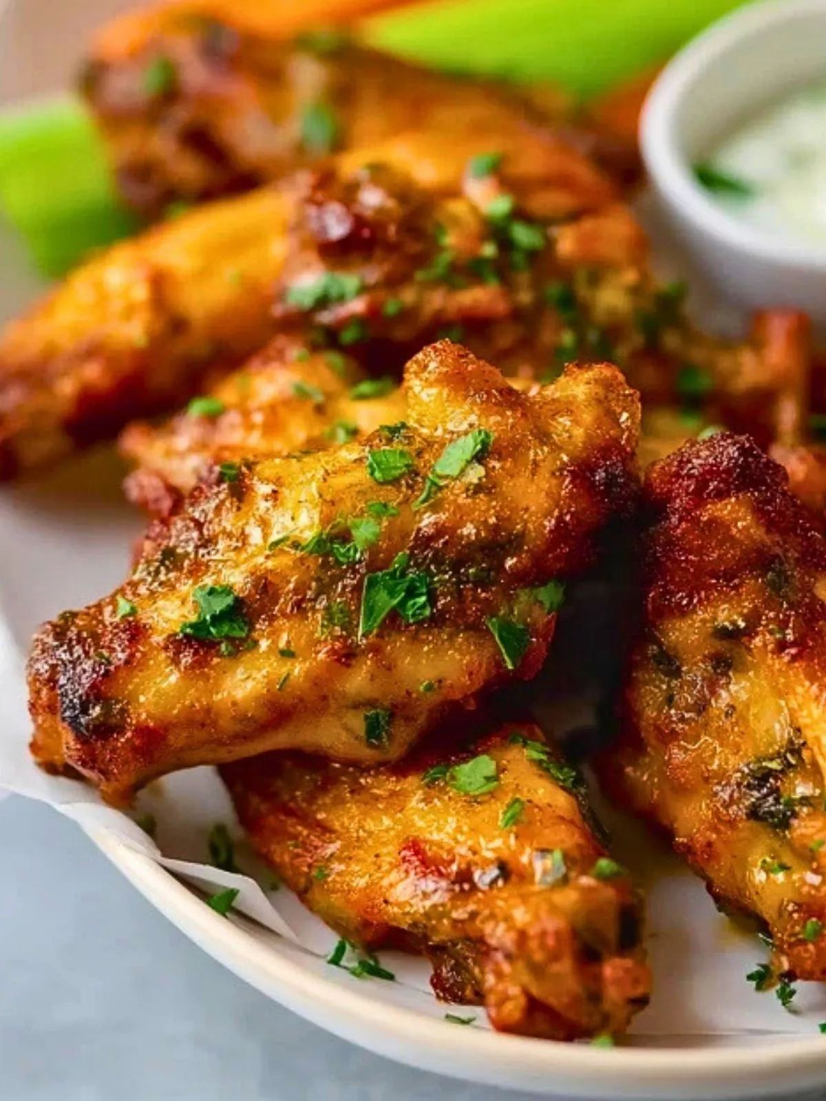 Disposez les ailes dans un plat, parsemez d’herbes fraîches hachées. Servez chaud avec la sauce de votre choix.