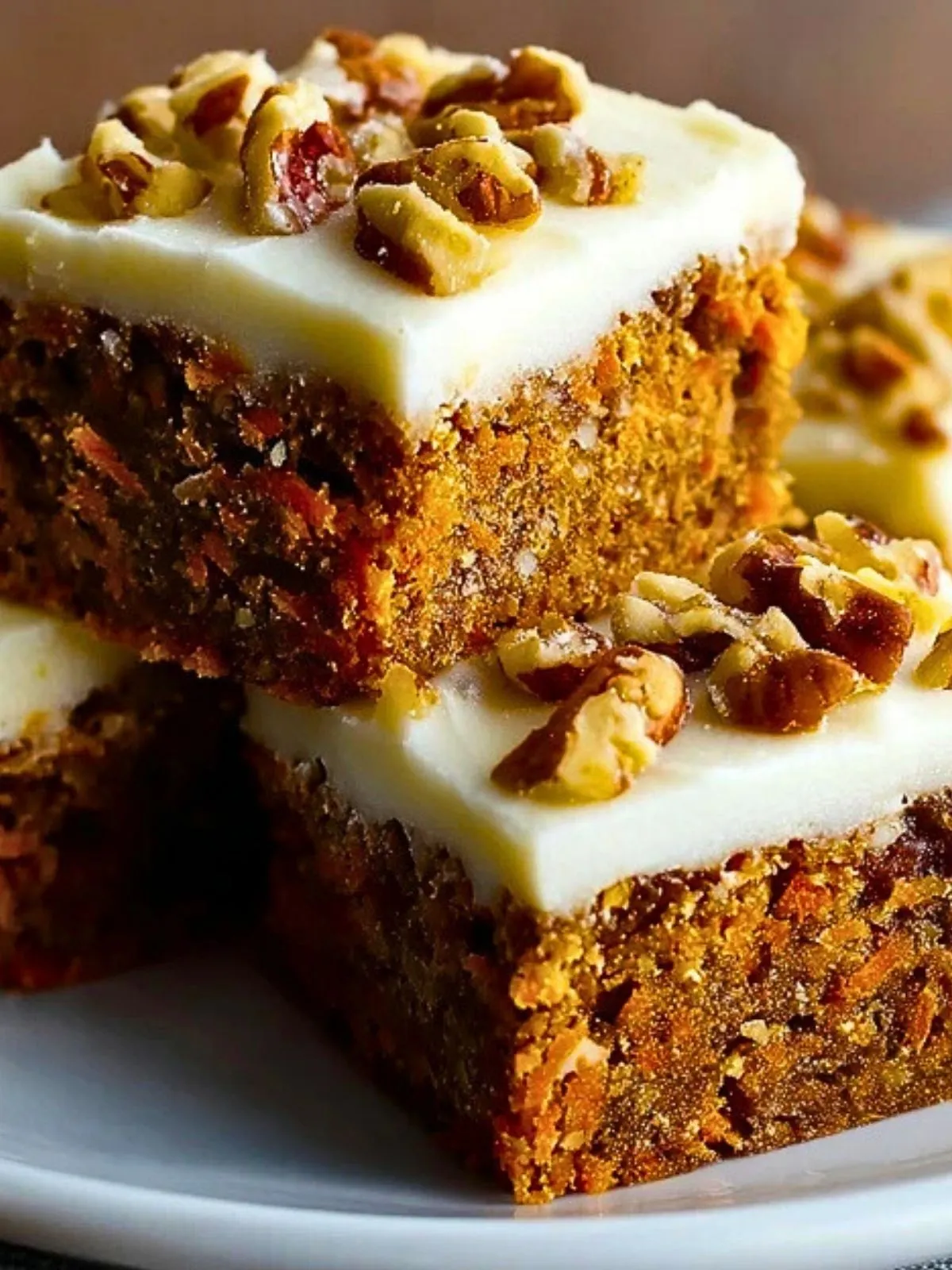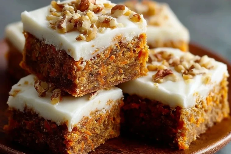 Ces barres de gâteau aux carottes décadentes avec un glaçage au fromage à la crème offrent une base ultra moelleuse riche en carottes, épices et noix, surmontée d’une couche généreuse de cream cheese onctueux et légèrement acidulé pour un dessert résolument gourmand et irrésistible.