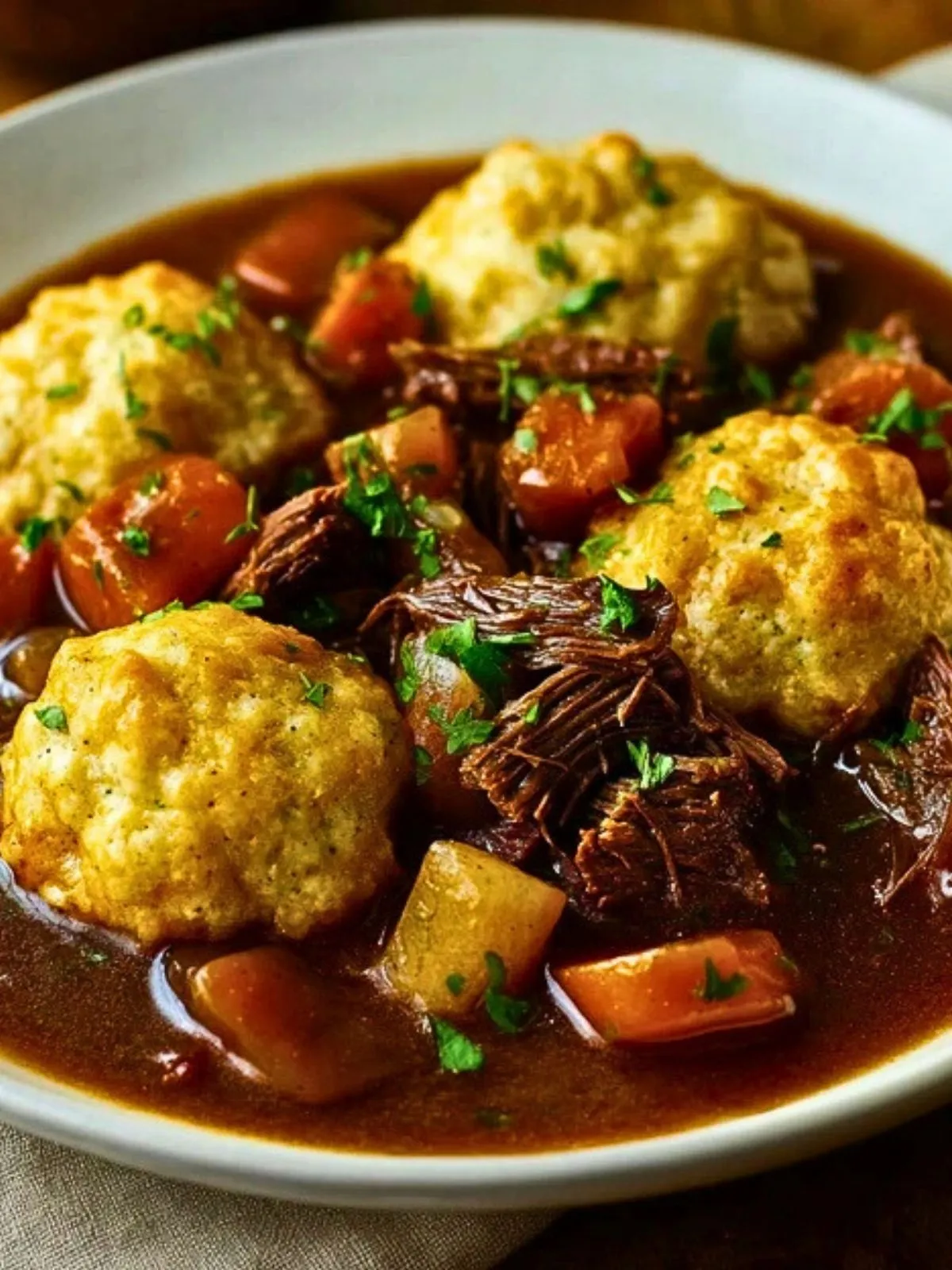 Retirez la cocotte du feu et laissez reposer 5 à 10 minutes. Parsemez de persil frais ciselé avant de servir. Ce temps de repos permet aux saveurs de se fondre et à la sauce de se stabiliser légèrement autour de la viande et des dumplings.