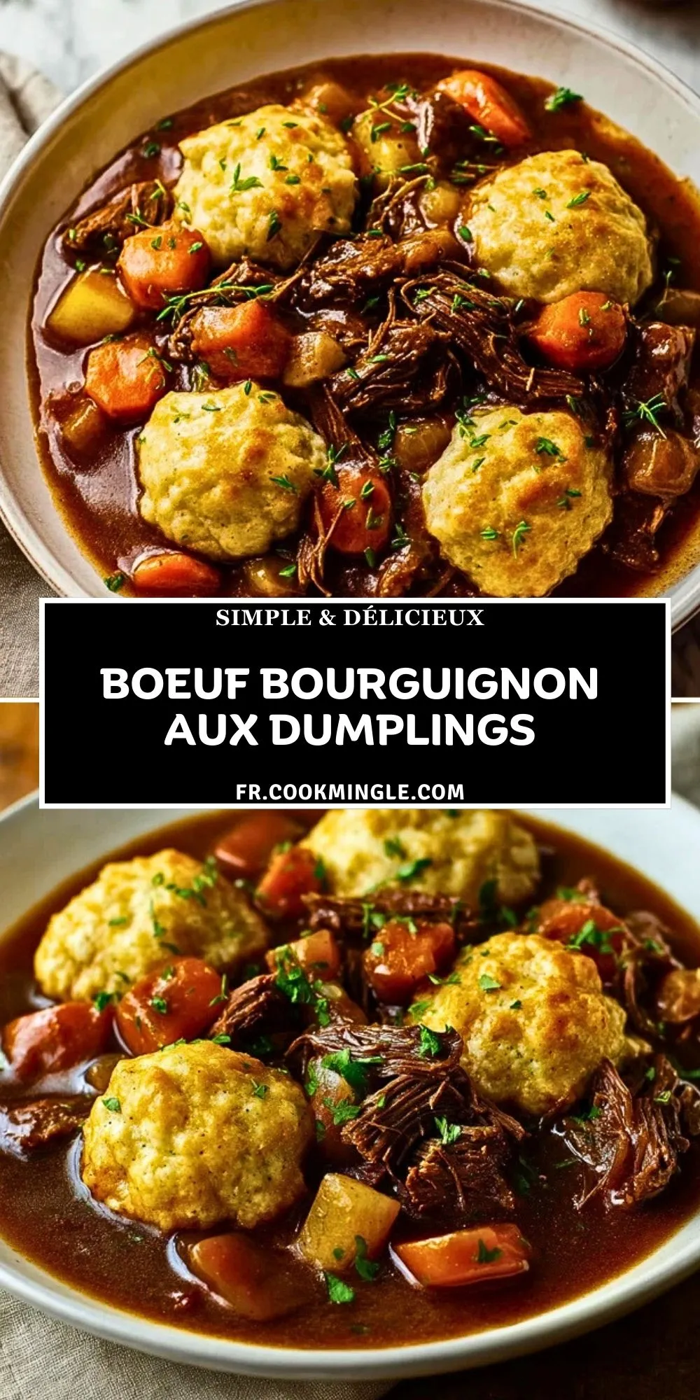 Épinglez ce boeuf bourguignon aux dumplings sur votre tableau Pinterest « Plats mijotés » pour le retrouver facilement lors de vos envies de cuisine réconfortante. Et surtout, racontez en commentaires comment vous l’avez adapté : avez-vous ajouté des champignons, changé de vin, parfumé les dumplings avec d’autres herbes ? Partagez vos astuces, vos questions et vos réussites – c’est ainsi que l’on enrichit son carnet de recettes et que l’on se régale encore plus à chaque cocotte partagée.