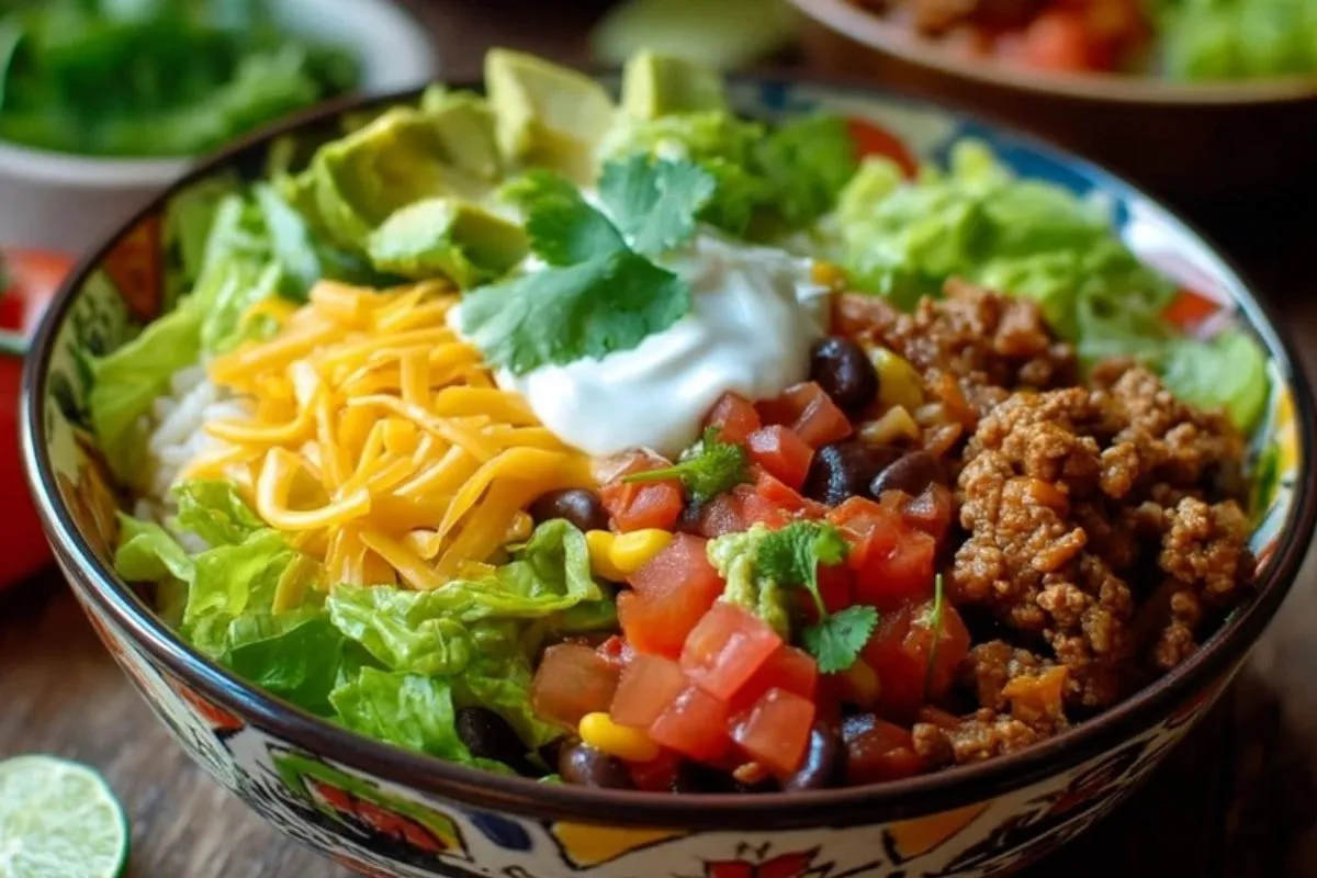 Le Bol de Tacos Rapide et Facile est un plat complet, coloré et personnalisable, réunissant bœuf assaisonné, riz moelleux, légumes frais et garnitures gourmandes. Idéal pour un repas rapide en semaine, il offre un parfait équilibre entre textures et saveurs.