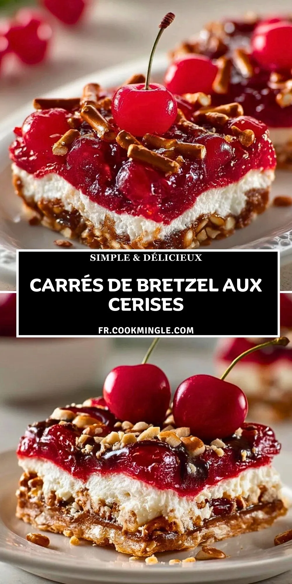 Ce dessert américain revisité à la française fait sensation, notamment grâce à sa facilité de préparation et son look spectaculaire. On y retrouve une base croustillante de bretzels concassés, une couche généreuse de crème fromagère légèrement sucrée et un nappage gourmand de cerises juteuses. Servis bien frais, ils sont un régal aussi beau que bon.