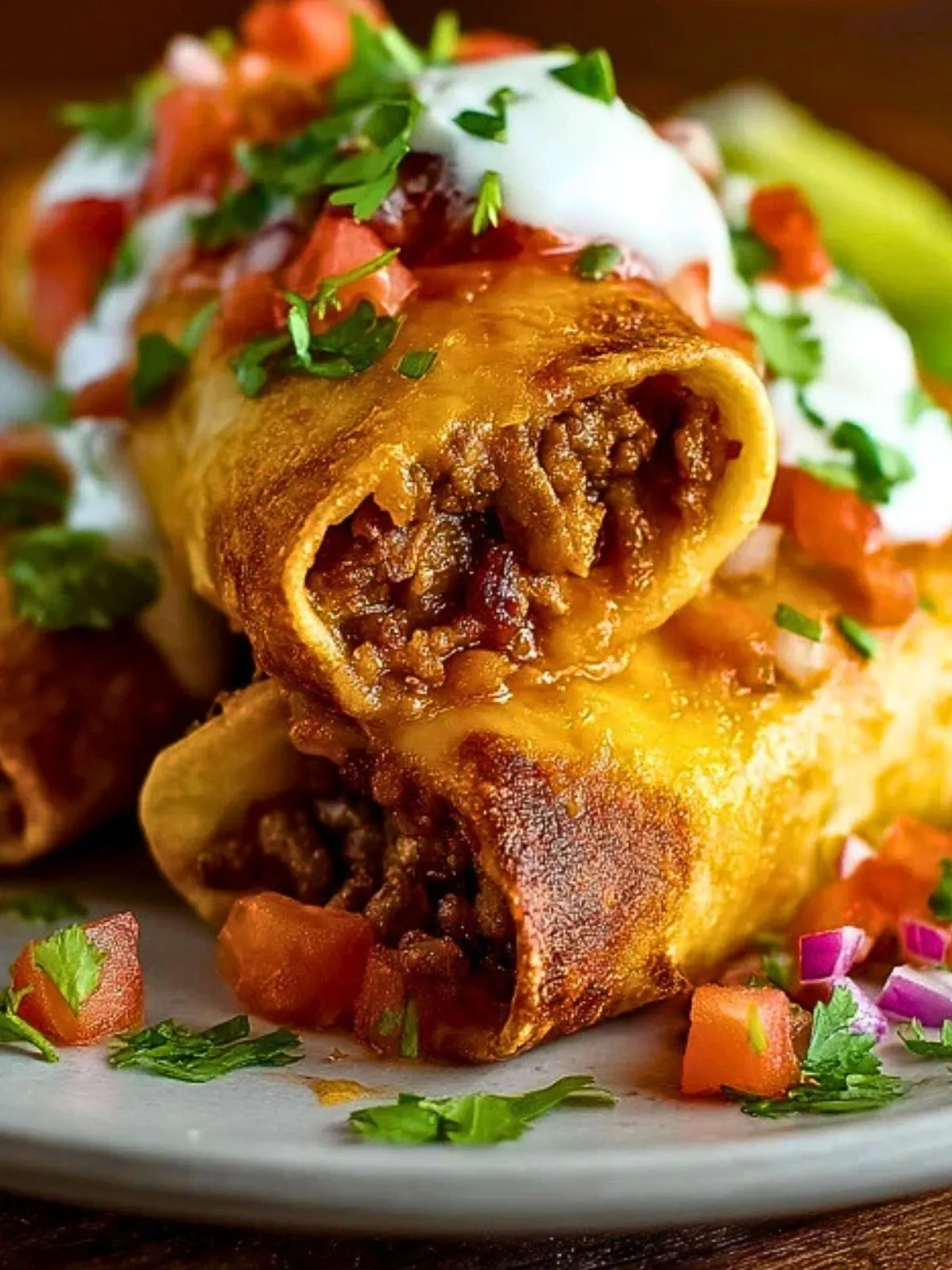 Servez les chimichangas croustillantes au fromage et au bœuf bien chaudes, nappées d’une cuillerée de crème fraîche ou de crème aigre, garnies de pico de gallo et parsemées de coriandre fraîche. Elles se marient à merveille avec du guacamole maison, une salade verte croquante ou du riz à la mexicaine pour un repas complet.