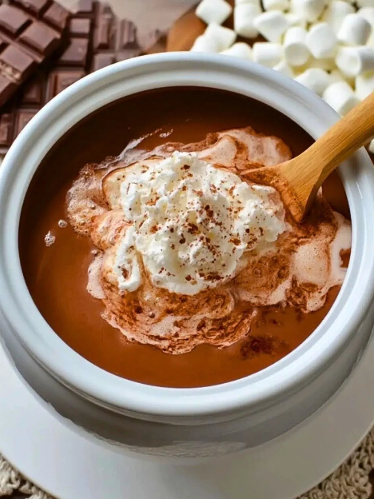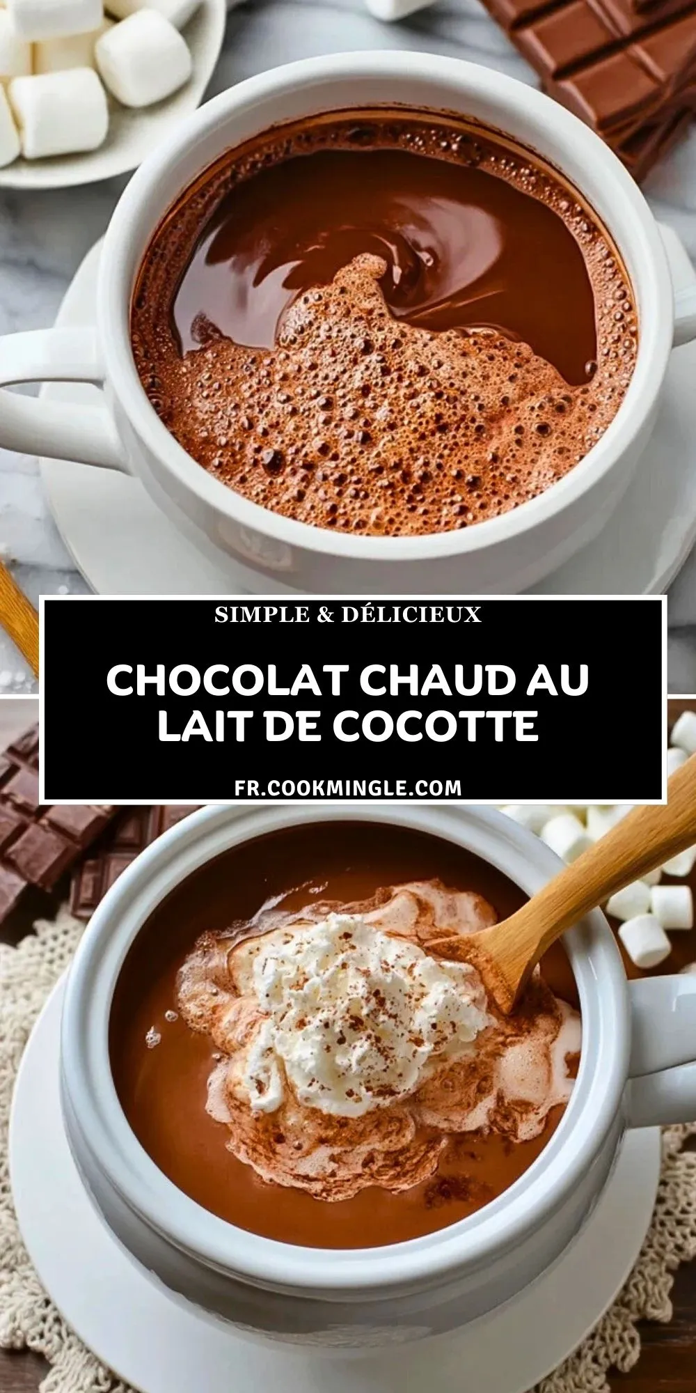 Ce chocolat chaud, généreux et crémeux, se démarque par la simplicité de sa préparation : tout doucement, les ingrédients se mélangent et s’harmonisent dans la cocotte, pour offrir une boisson gourmande et conviviale. Servi avec des guimauves fondantes ou une touche de crème fouettée, il devient irrésistible lors des goûters ou des brunchs d’hiver.