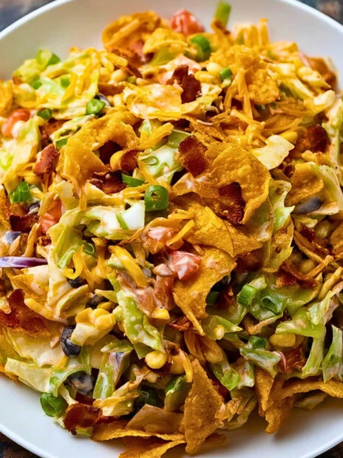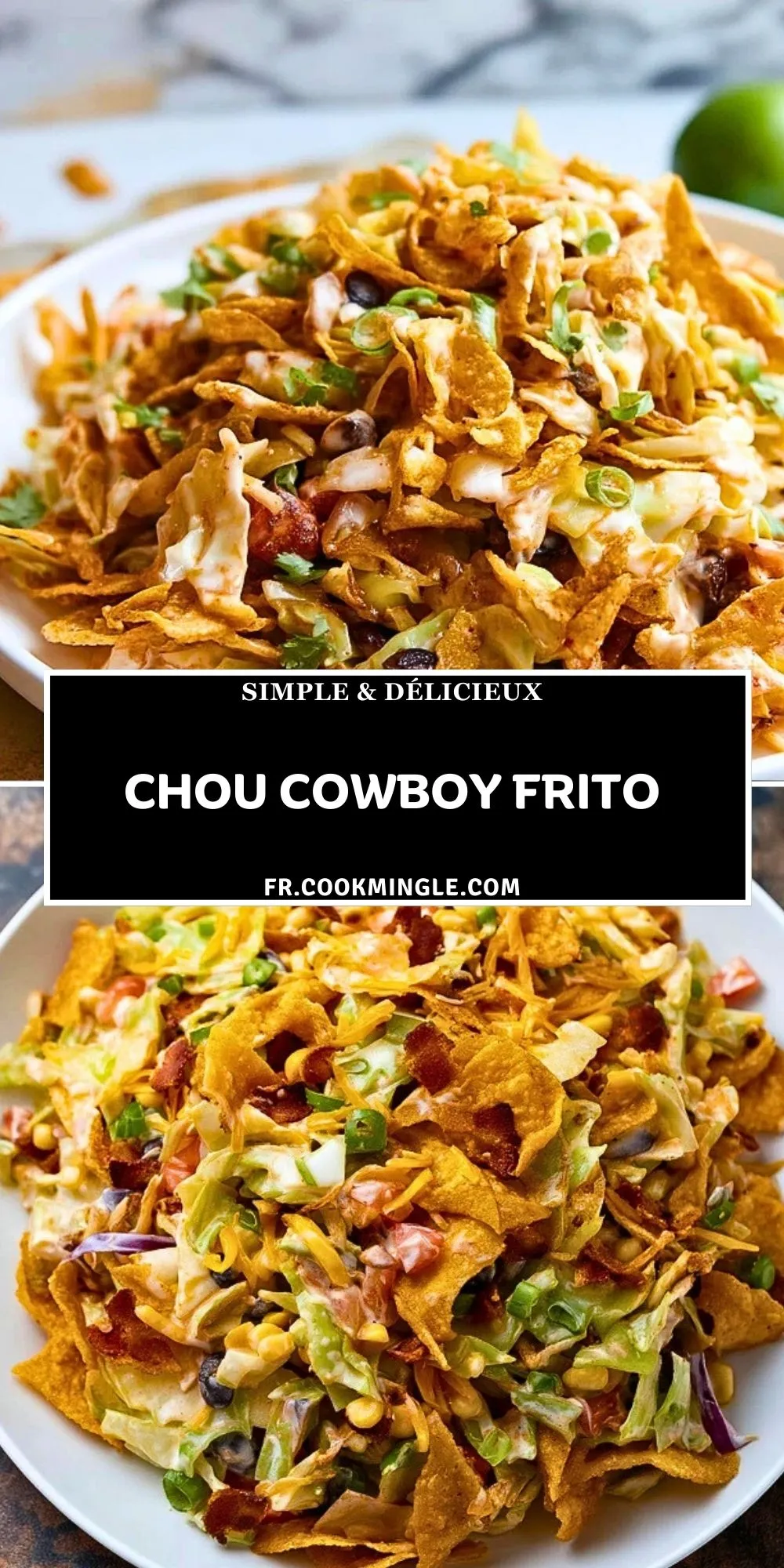 Parce qu’il combine des textures très différentes dans une seule assiette, avec une préparation facile et un résultat toujours plaisant. Le chou apporte de la tenue, les légumes donnent de la fraîcheur, les haricots et le fromage rendent le tout plus nourrissant, et les fritos ajoutent ce croustillant salé qui transforme une simple salade en plat vraiment addictif.