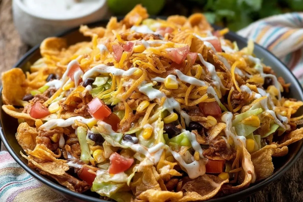 Parce qu’il combine des textures très différentes dans une seule assiette, avec une préparation facile et un résultat toujours plaisant. Le chou apporte de la tenue, les légumes donnent de la fraîcheur, les haricots et le fromage rendent le tout plus nourrissant, et les fritos ajoutent ce croustillant salé qui transforme une simple salade en plat vraiment addictif.