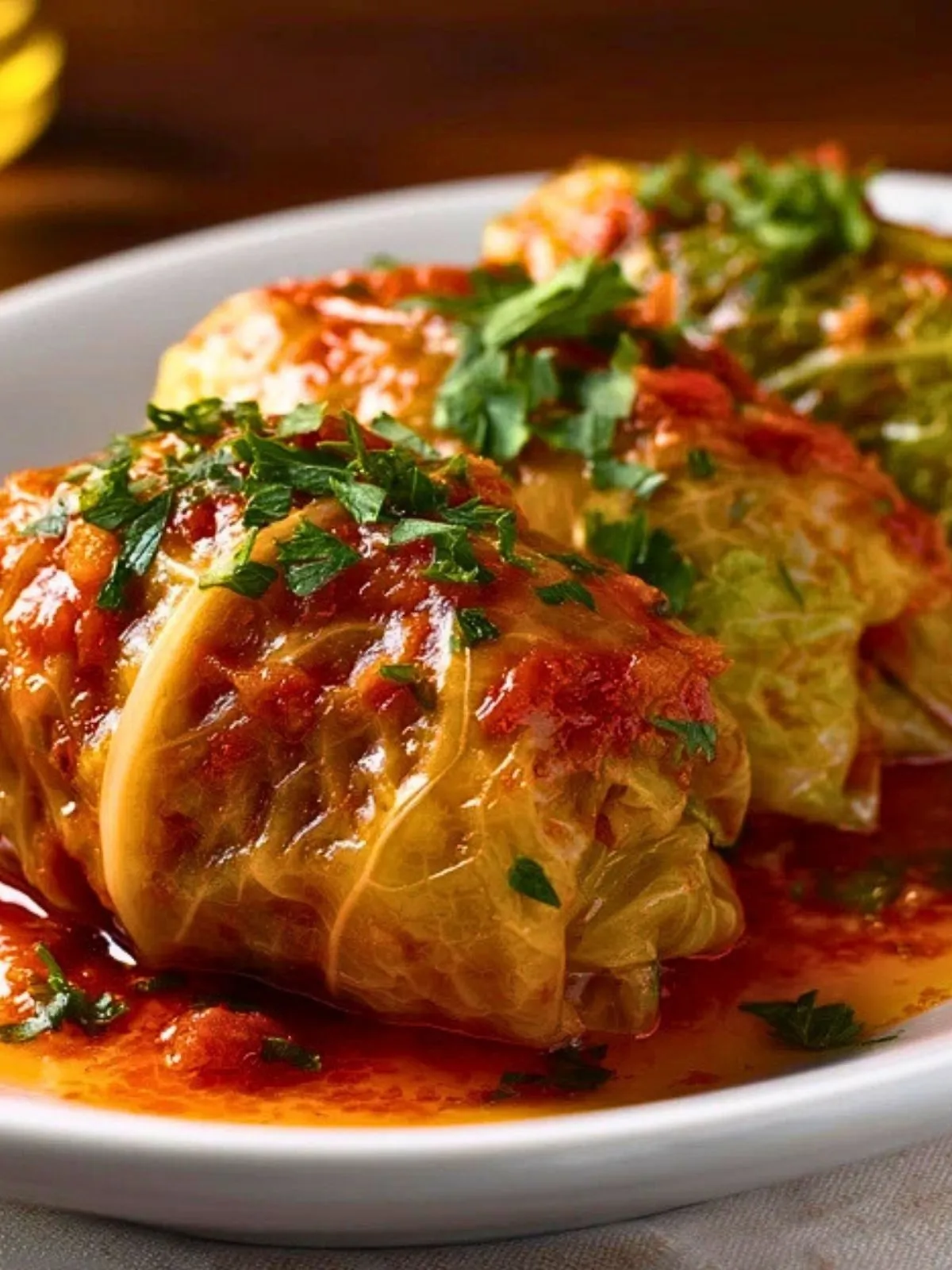 Les choux farcis se servent bien chauds, généreusement nappés de leur sauce tomate parfumée. Ils accompagnent parfaitement une simple purée de pommes de terre maison, une purée de céleri, du riz blanc ou même une bonne tranche de pain de campagne pour saucer la sauce. C’est un plat convivial qui se présente volontiers directement dans la cocotte posée au milieu de la table.
