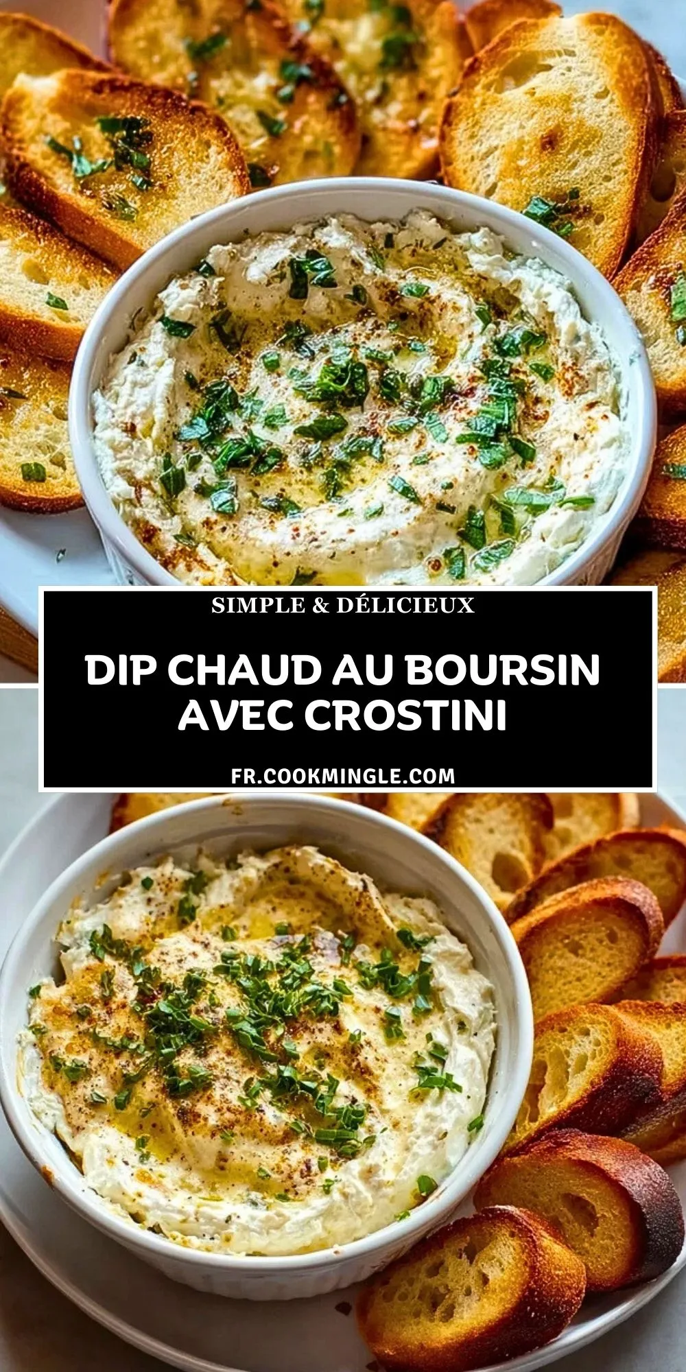 Keywords: dip chaud boursin, apéritif fromage, crostini maison, dip gratiné