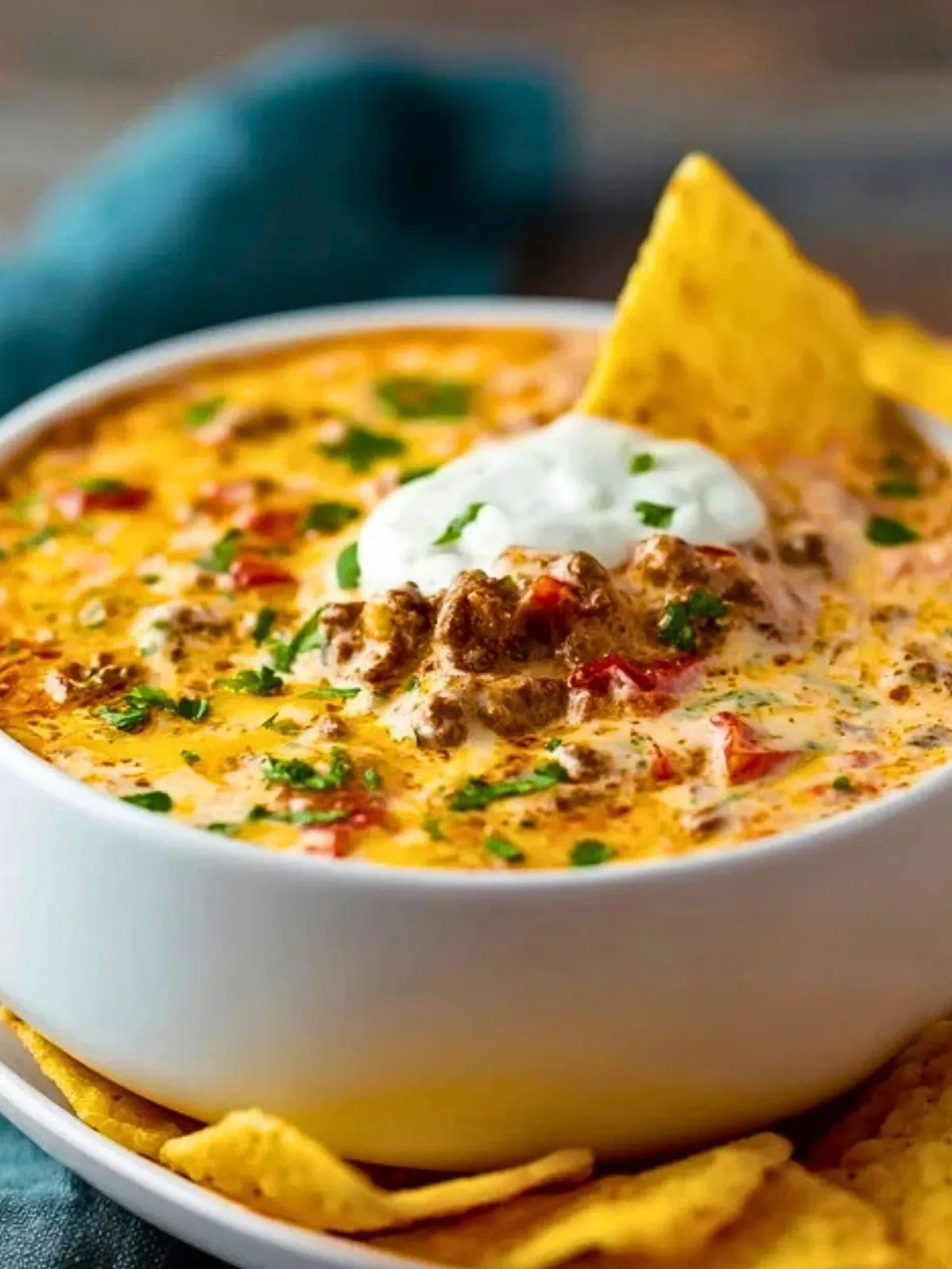 Ce dip fromage fondu avec viande hachée et crème acide est une trempette généreuse et ultra gourmande, idéale pour les apéros conviviaux ou les soirées télé, à savourer avec des chips de maïs bien croustillantes.