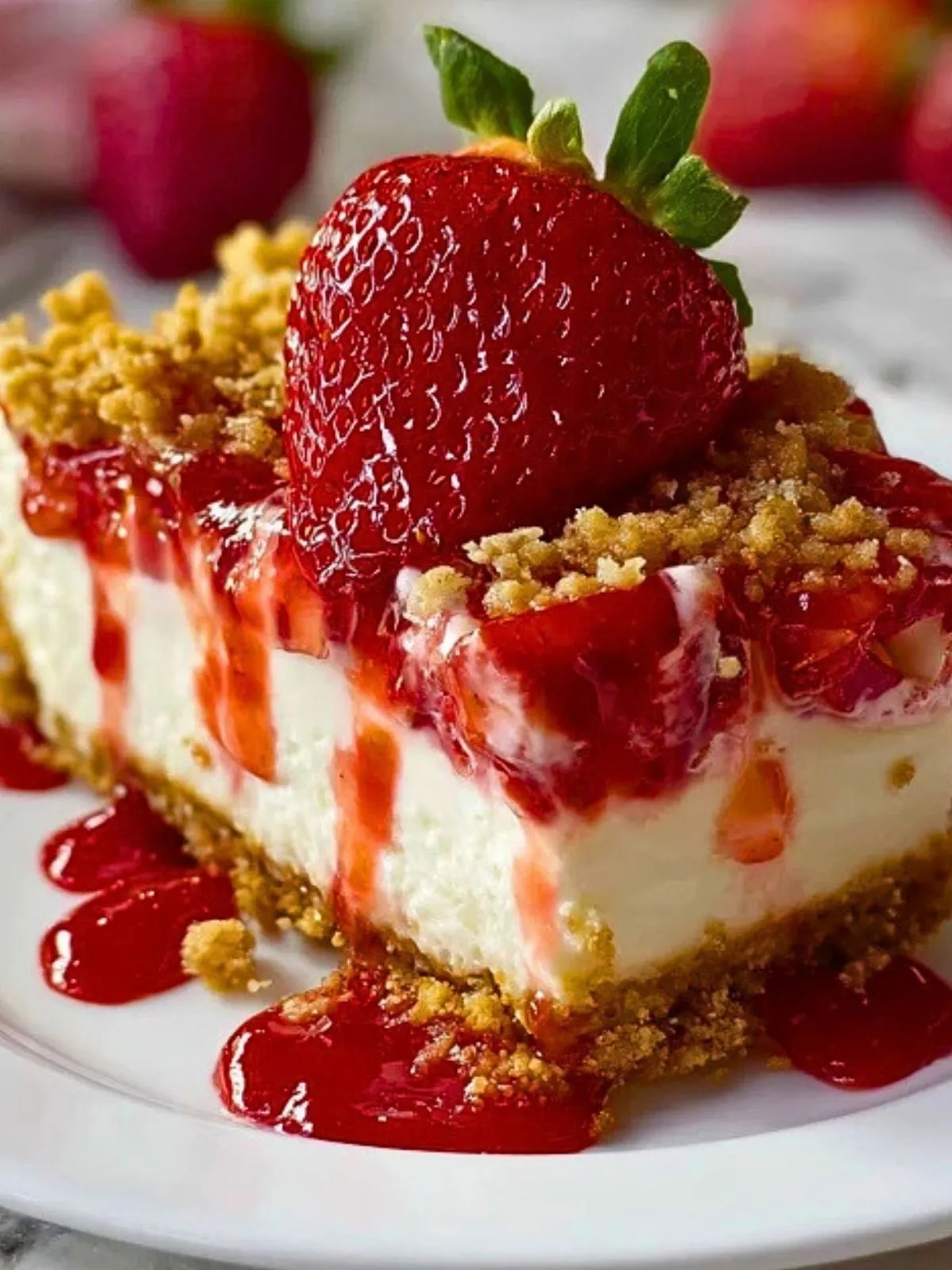 Un dessert frais et croquant où se mêlent une base biscuitée croustillante, une crème légère au fromage blanc et un généreux coulis de fraises. Ce gâteau, sans cuisson, allie la douceur acidulée des fruits à la gourmandise du crumble. Parfait pour les beaux jours ou les grandes occasions !
