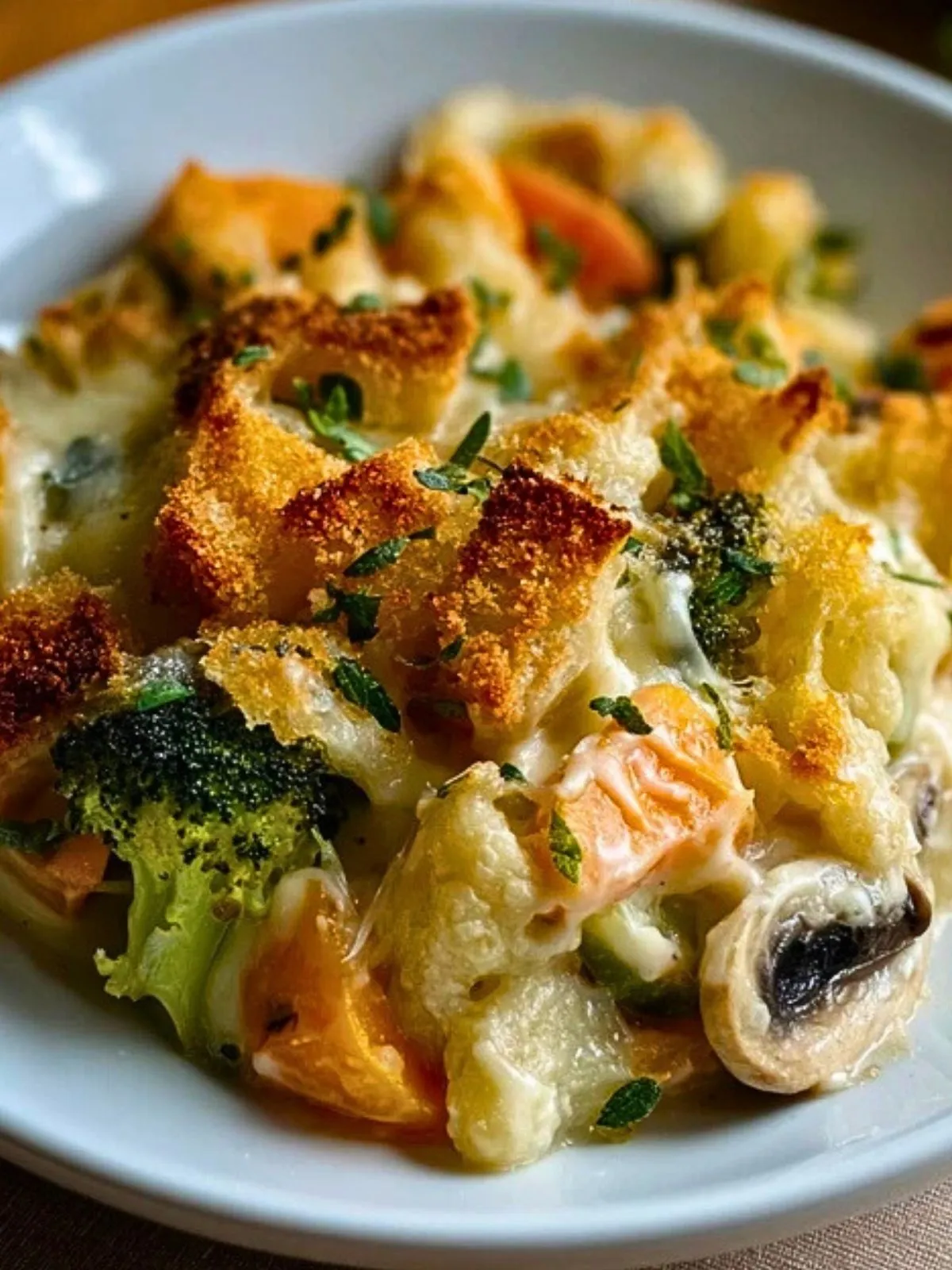 Parce qu’il allie la légèreté des légumes à la gourmandise d’une gratinée riche en saveurs. Les légumes sont précuits juste ce qu’il faut pour rester légèrement fermes, puis enrobés d’une sauce crémeuse qui nappe sans alourdir. La chapelure parfumée au fromage forme une croûte croustillante qui contraste avec le fondant du cœur du gratin. C’est un plat généreux, convivial, qui permet de varier les légumes sans jamais être ennuyeux.