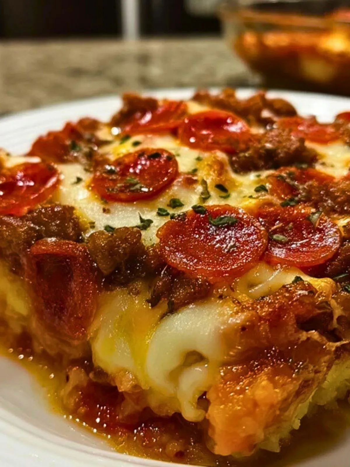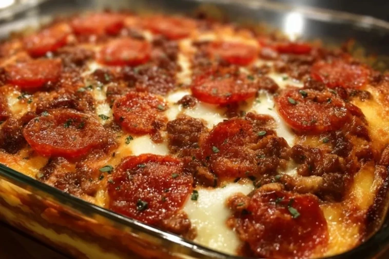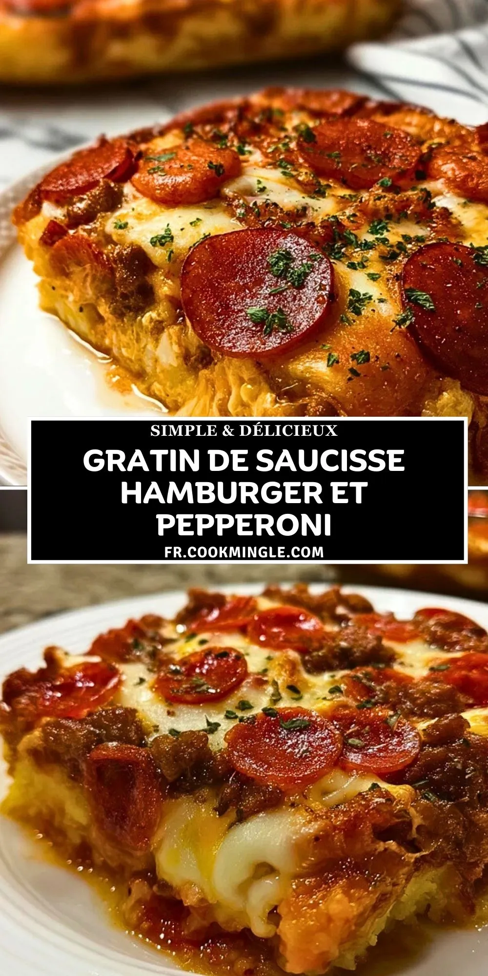 Ce gratin généreux rassemble tout ce que l’on aime dans les plats familiaux bien gratinés : une viande savoureuse, une sauce riche en goût, du fromage fondant et une surface dorée qui sort du four en embaumant toute la cuisine. Entre les rondelles de pepperoni légèrement croustillantes, la chair à saucisse parfumée et le bœuf haché bien revenu, chaque bouchée offre un mélange réconfortant et gourmand.