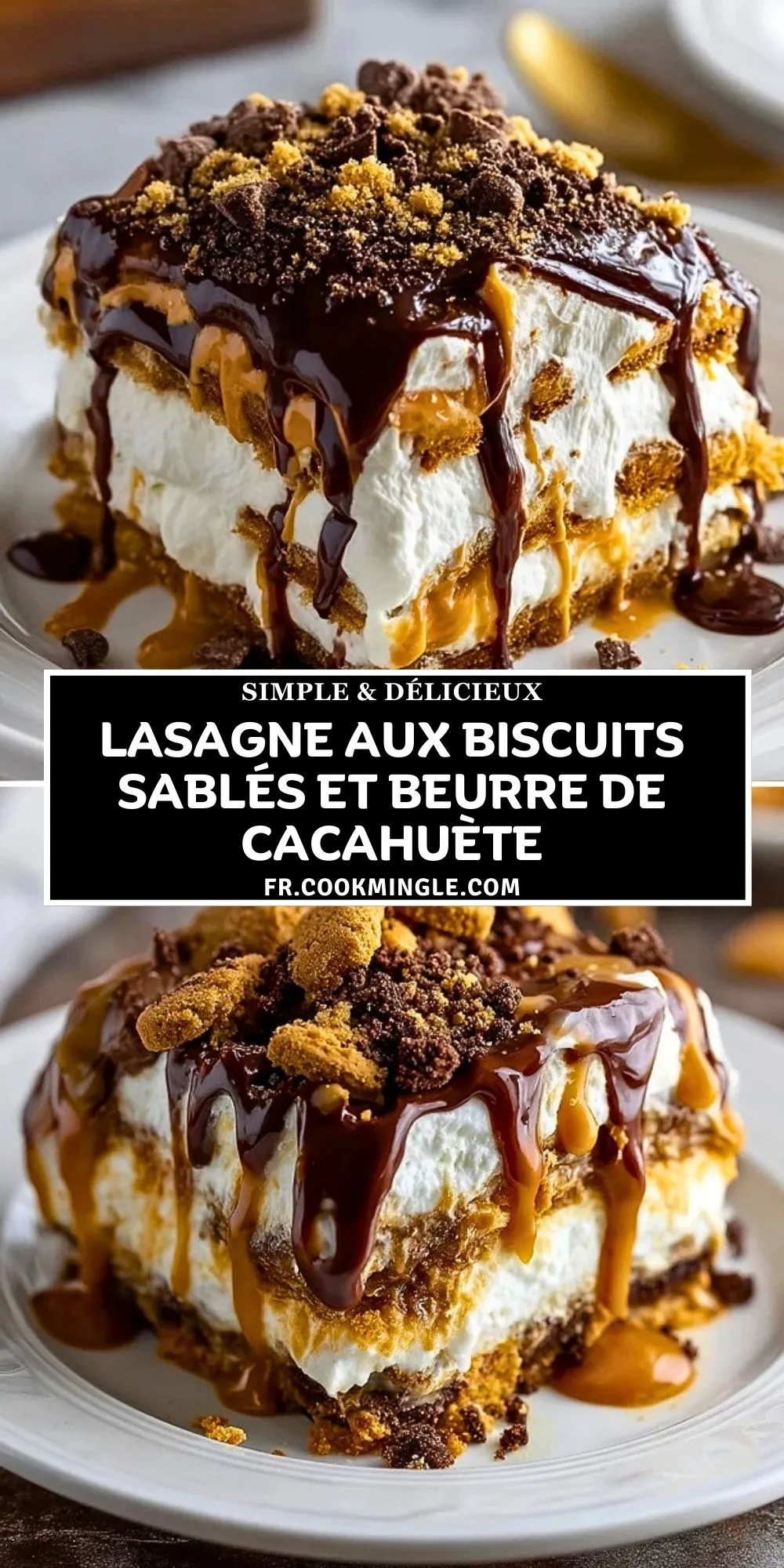 Keywords: lasagne dessert, biscuits sablés, beurre de cacahuète, dessert sans cuisson, dessert chocolat cacahuète