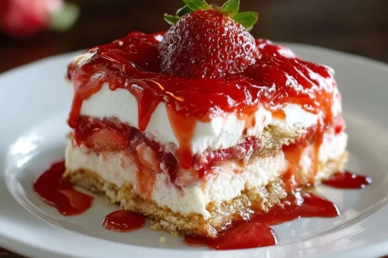 Cette lasagne de cheesecake aux fraises sans cuisson est un dessert frais, crémeux et généreux, composé d’une base biscuitée, d’une garniture onctueuse au fromage frais, de fraises juteuses et d’un coulis gourmand. Facile à préparer à l’avance, elle est parfaite pour les repas d’été, les fêtes familiales ou chaque fois que vous voulez un dessert élégant sans allumer le four.