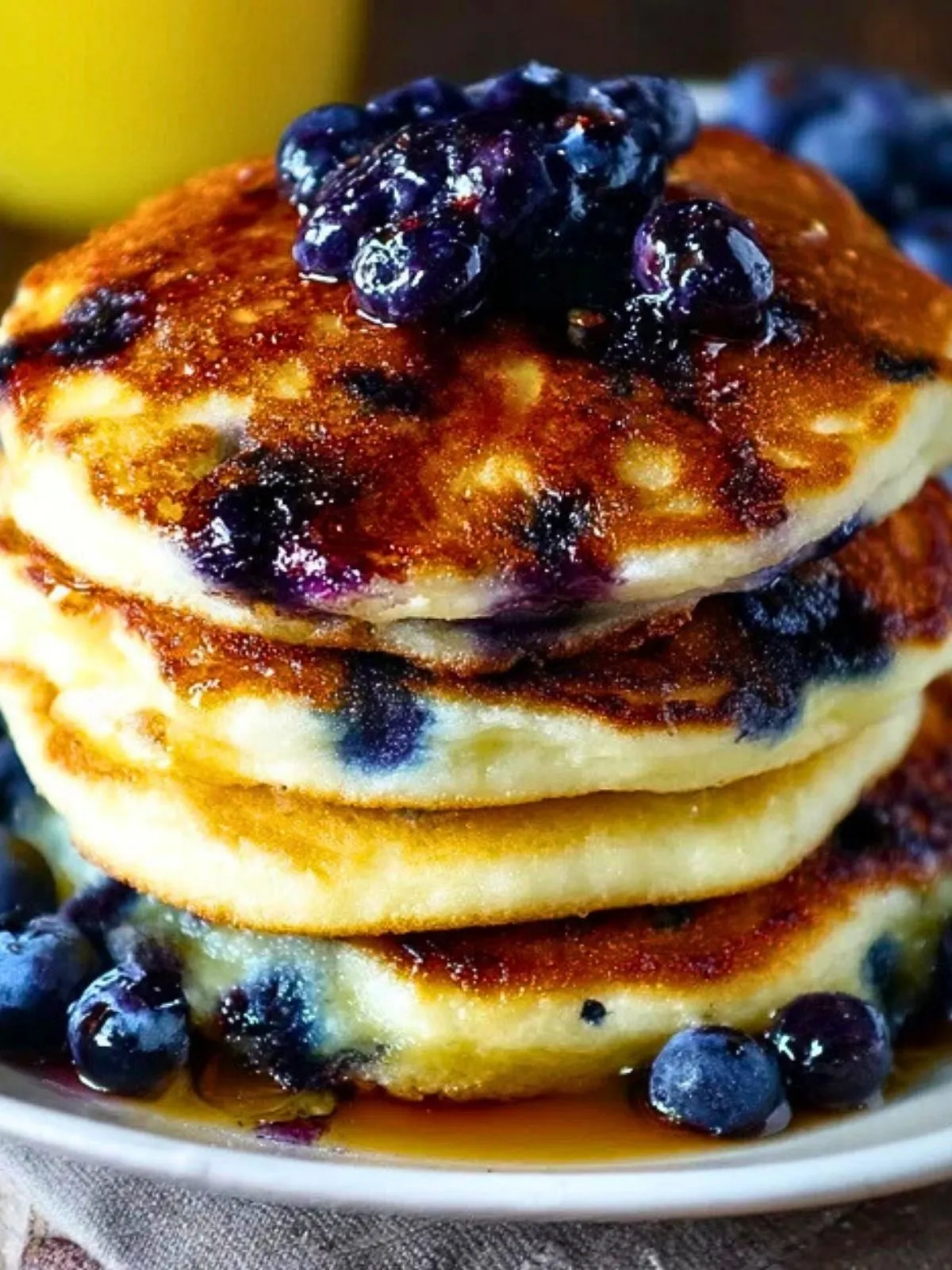 Empilez les pancakes encore tièdes, ajoutez quelques myrtilles fraîches et un filet de sirop d’érable ou de miel pour encore plus de gourmandise.