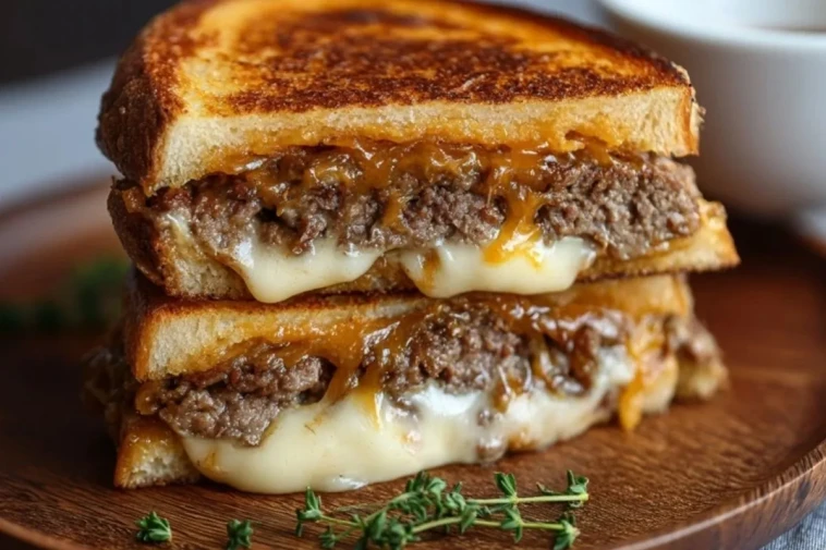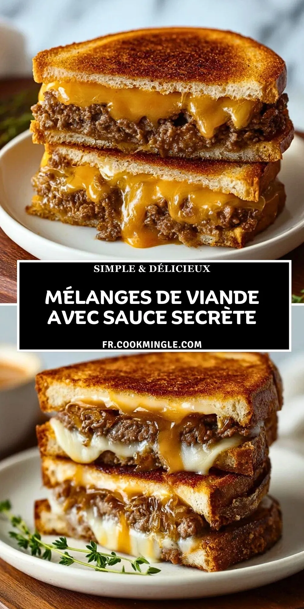 Ces Mélanges de Viande avec Sauce Secrète sont des sandwichs chauds ultra gourmands : pain doré au beurre, viande hachée juteuse, oignons caramélisés, sauce secrète crémeuse et fromage coulant. Une version façon croque-monsieur/burger, parfaite pour un dîner réconfortant ou une soirée conviviale.