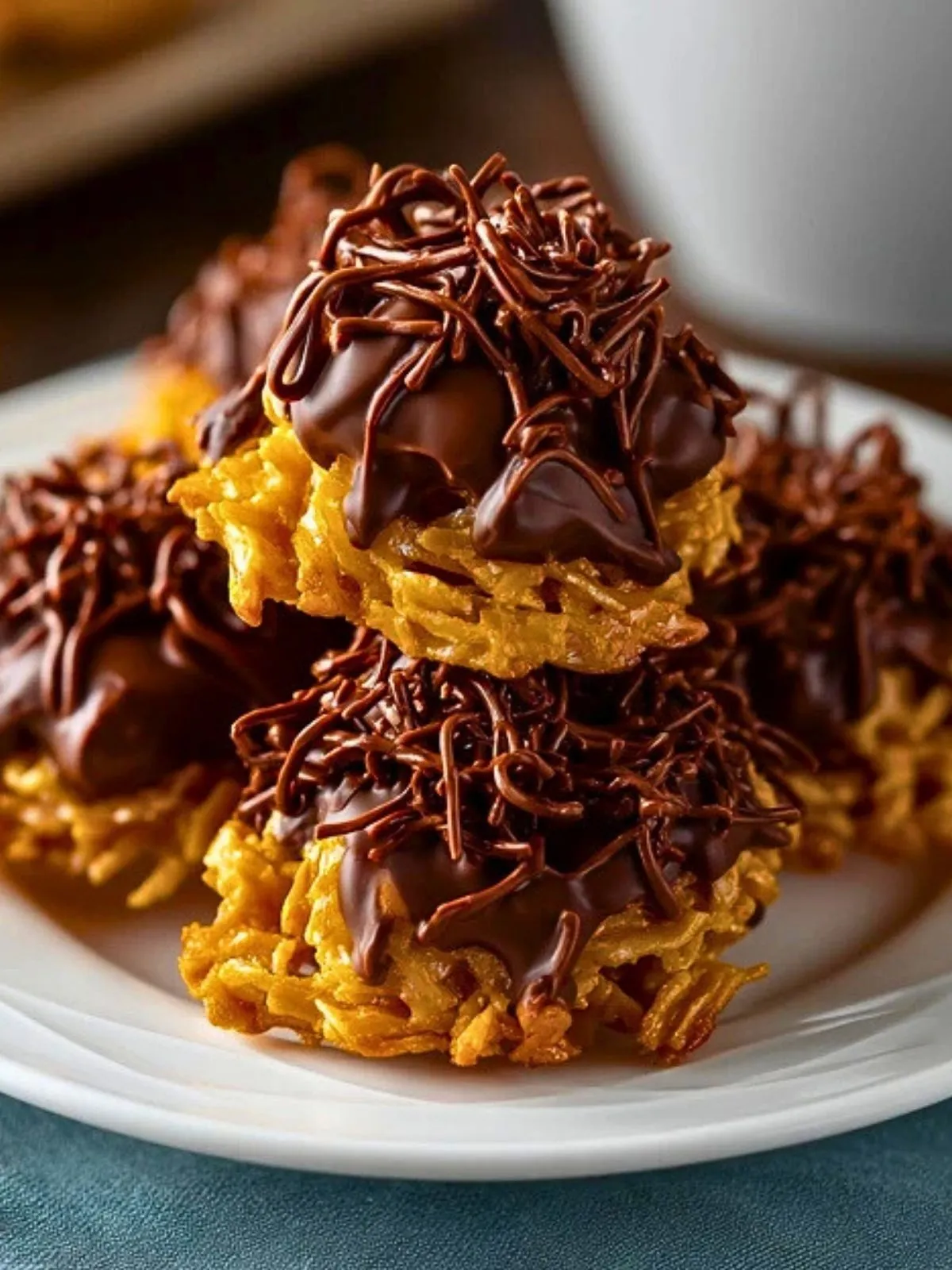 Les Montagnes De Chocolat Et Beurre De Cacahuète sont des petits tas croustillants composés de flocons de maïs (et parfois d’amandes effilées) liés par un mélange chaud de beurre, miel et beurre de cacahuète, puis partiellement trempés dans du chocolat noir fondu. Une fois refroidies, ces bouchées prennent une forme de « montagnes » gourmandes qui associent le croquant des céréales, la richesse du beurre de cacahuète et l’intensité du chocolat.
