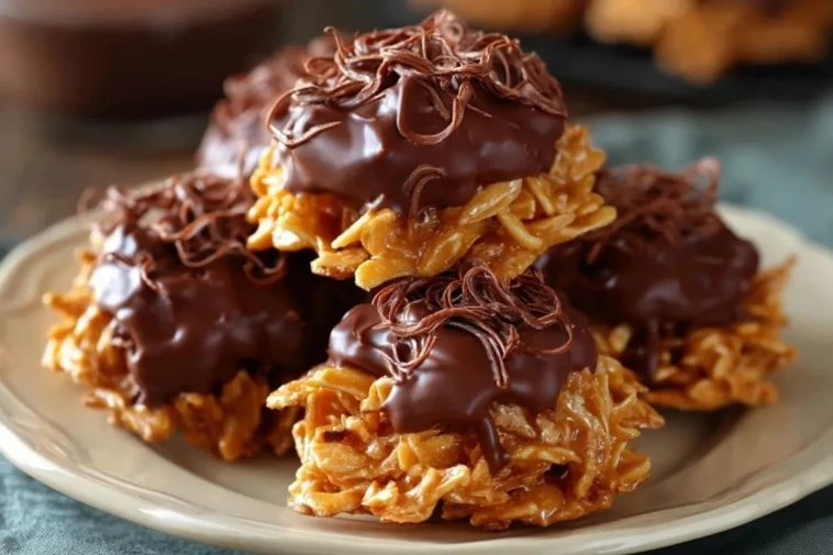 Ces Montagnes De Chocolat Et Beurre De Cacahuète sont de petites bouchées croustillantes aux flocons de maïs et aux amandes, enrobées d’un caramel au beurre de cacahuète et trempées dans un chocolat noir fondant – parfaites pour un dessert rapide sans cuisson ou un plateau de gourmandises à partager.