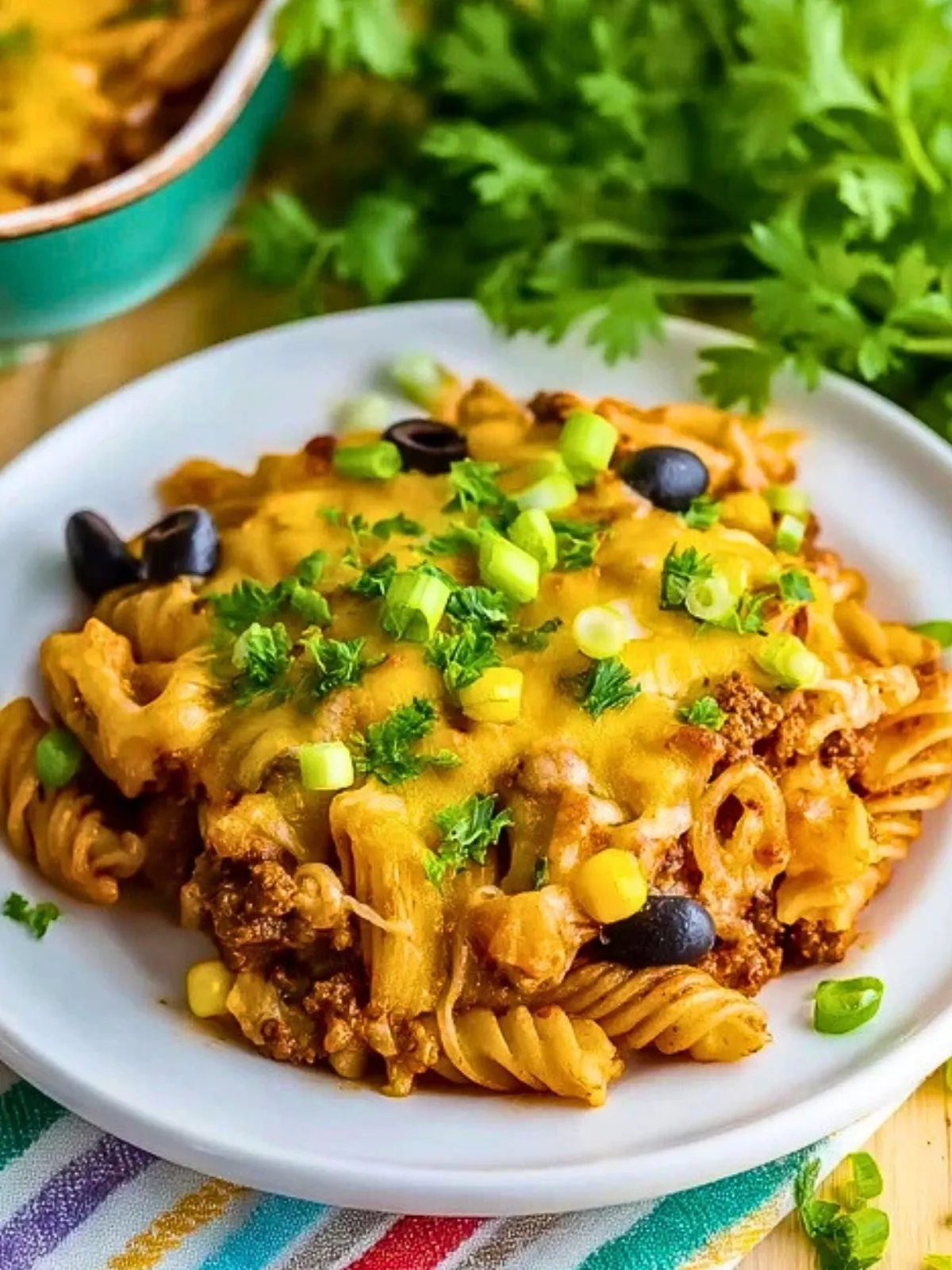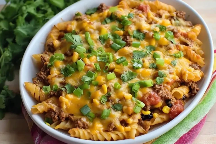 Cette Pasta Taco Au Four est un gratin de pâtes d’inspiration tex-mex, où des pâtes al dente sont mélangées à une sauce au bœuf haché, tomates, maïs et haricots noirs parfumés aux épices à taco, puis recouvertes de fromage fondant pour un plat familial, coloré et ultra réconfortant.