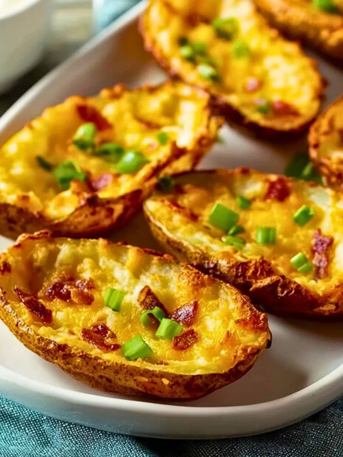 Ces peaux de pommes de terre au cheddar au four sont des coquilles croustillantes garnies de purée moelleuse, de cheddar filant, de bacon croustillant, de crème fraîche et de ciboulette, parfaites pour un apéritif gourmand ou un repas réconfortant.