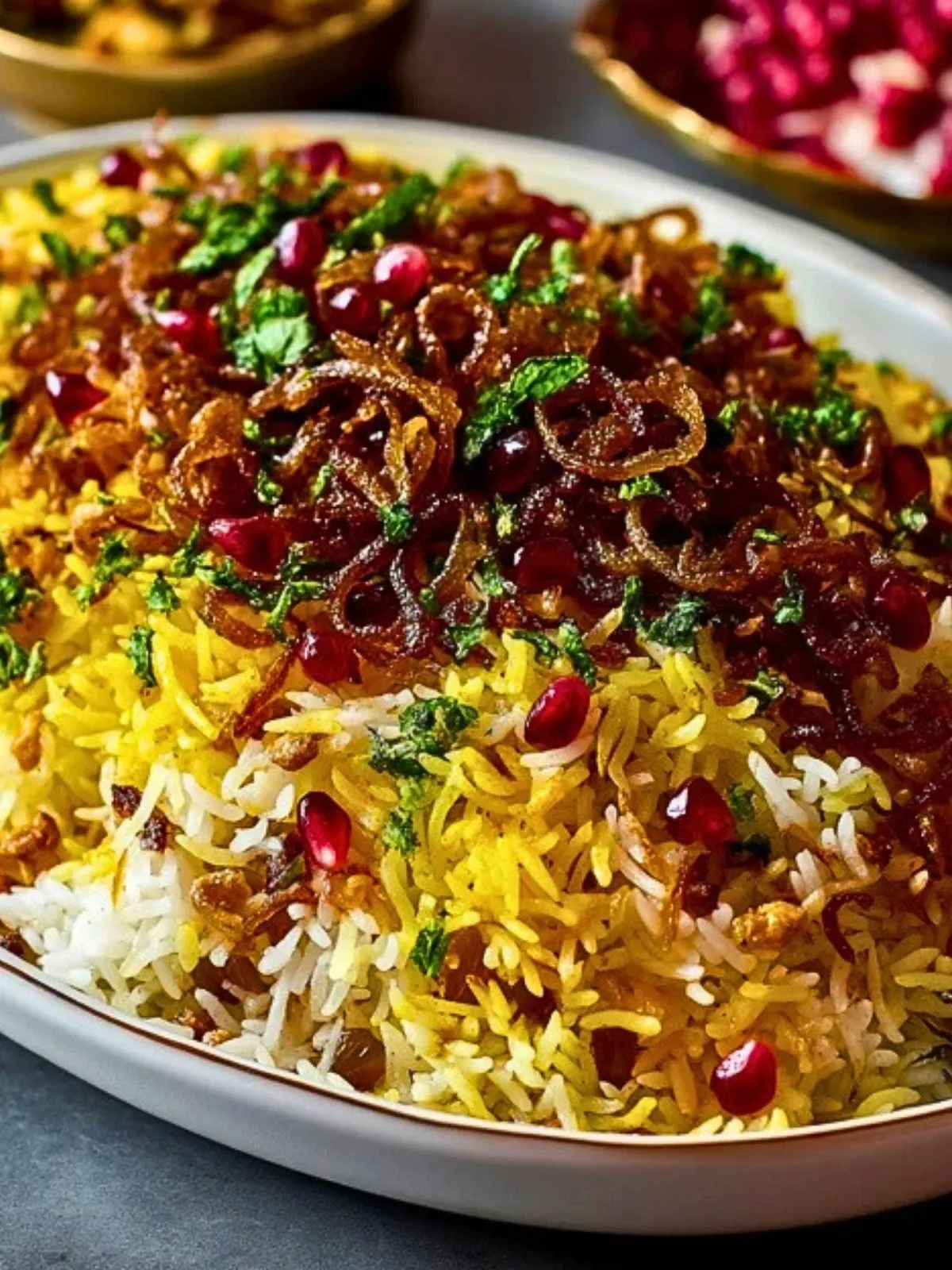 Un riz festif iranien, parfumé au safran, décoré de fruits secs, d’oignons caramélisés, de graines de grenade et d’herbes fraîches. Une explosion de saveurs et de couleurs pour sublimer vos tables de fête.