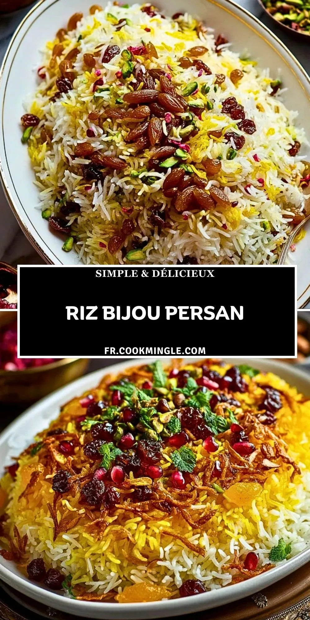 Le Riz Bijou Persan, également appelé « Jeweled Rice », est un plat festif traditionnel venu d’Iran, connu pour sa beauté visuelle et son parfum irrésistible. Chaque grain de riz est délicatement parfumé, coloré et orné de fruits secs, d’épices, d’herbes fraîches et parfois de graines de grenade pour une explosion de saveurs et de couleurs à chaque bouchée. C’est un mets incontournable lors des grandes occasions, où il brille littéralement au centre de la table.
