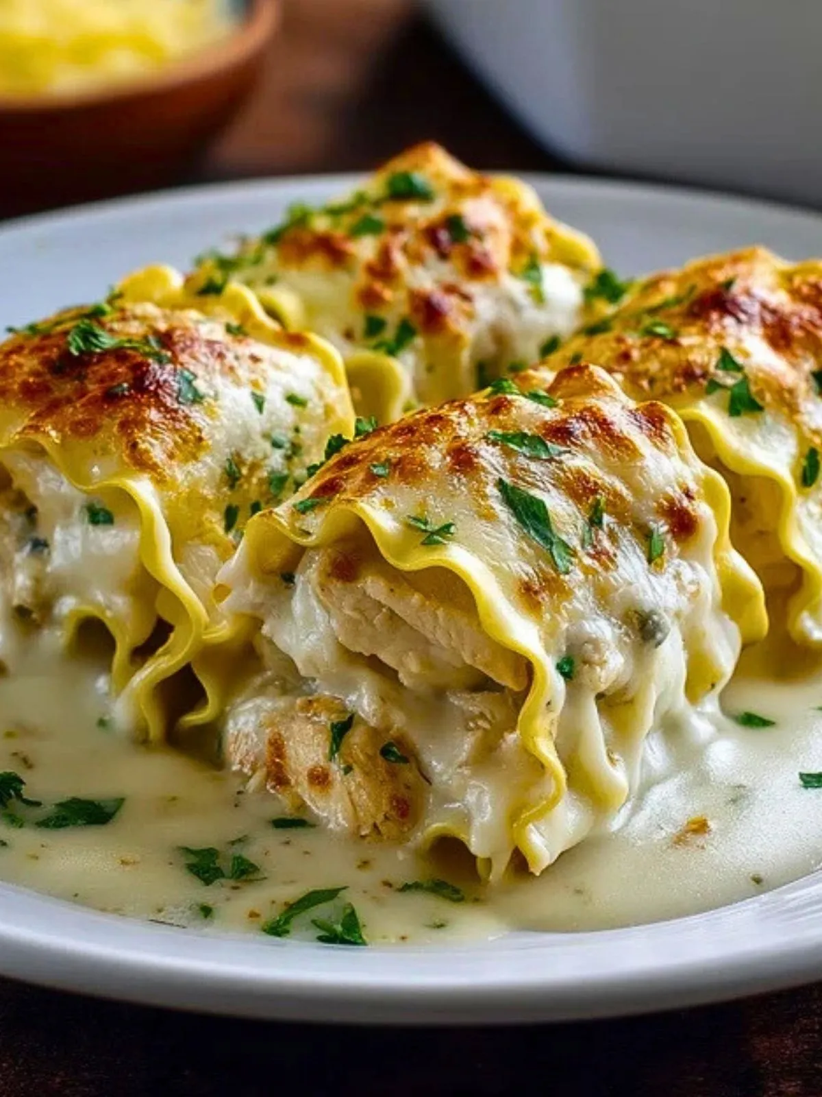 Versez le reste de sauce Alfredo sur les roulés, puis parsemez de mozzarella. Enfournez pendant environ 20 à 25 minutes, jusqu’à ce que le dessus soit bien gratiné. Terminez avec du persil frais avant de servir.