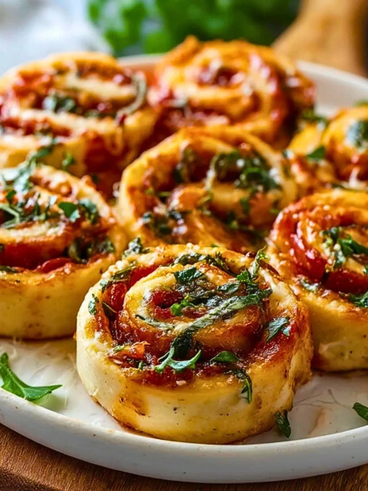 Ces roulés italiens irrésistibles sont de petits escargots de pâte à pizza garnis de sauce tomate, de mozzarella fondante, de jambon cru et d’épinards, parfaits pour un apéritif convivial ou un diner léger avec une salade.