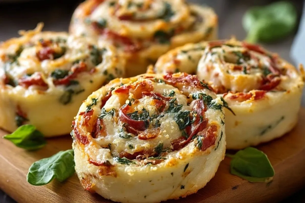 Ces roulés italiens irrésistibles sont de petits escargots de pâte à pizza garnis de sauce tomate, de mozzarella fondante, de jambon cru et d’épinards, parfaits pour un apéritif convivial ou un diner léger avec une salade.