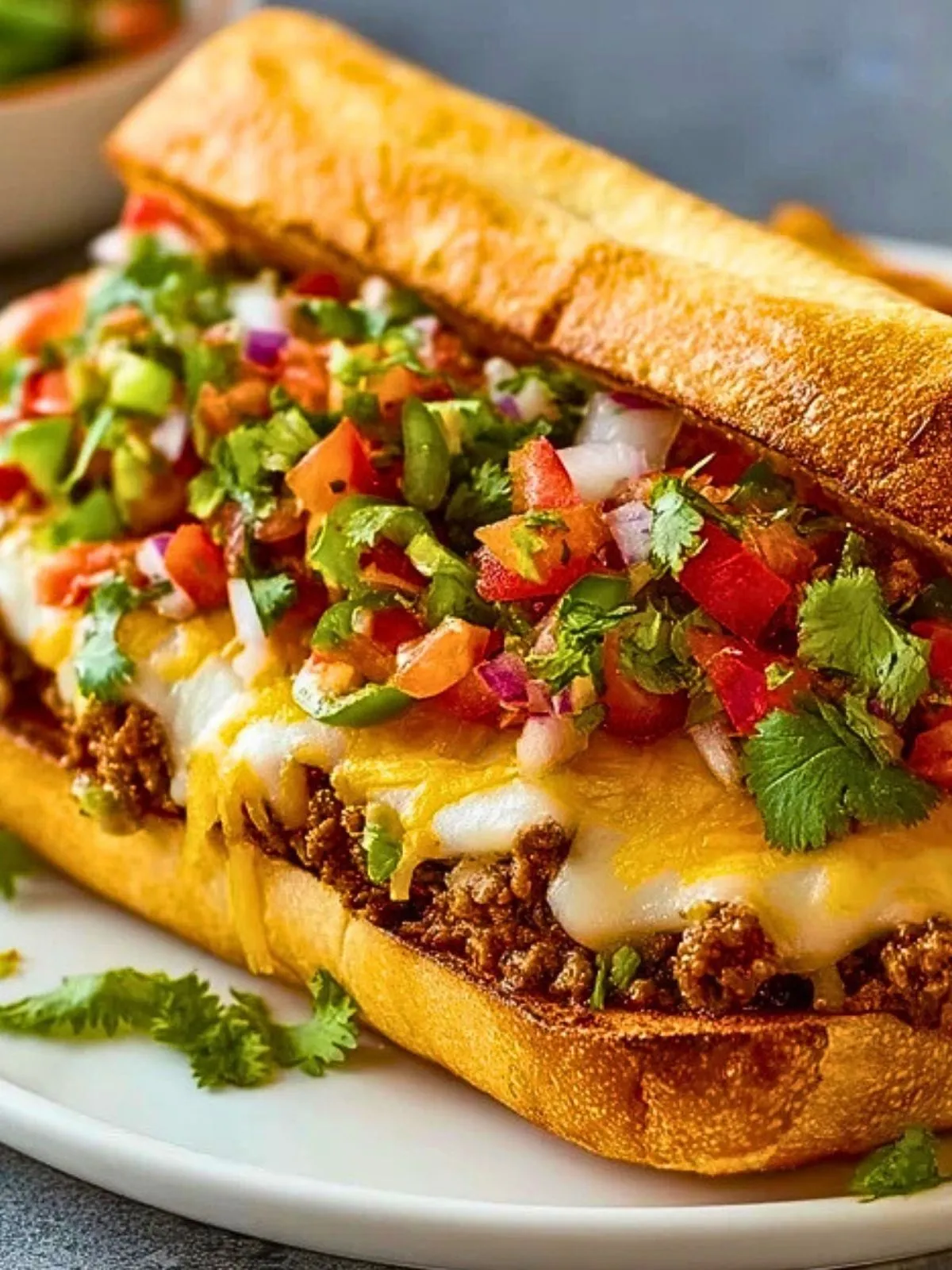 Garni de bœuf haché relevé, de fromage filant et d’une salsa fraîche aux tomates et à la coriandre, ce sandwich est idéal pour un repas convivial, rapide et généreux. Chaque bouchée dévoile une explosion de textures et d’arômes.