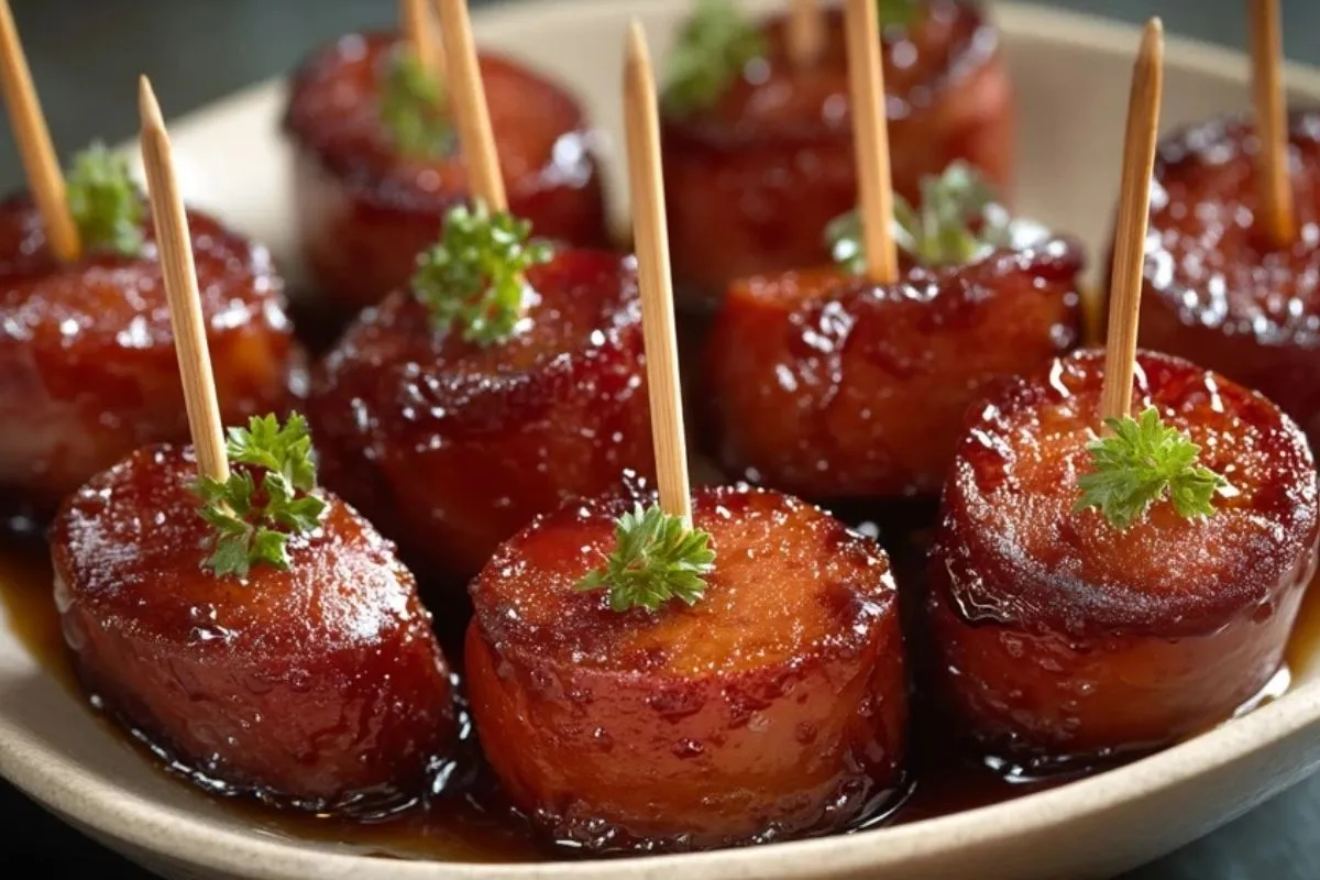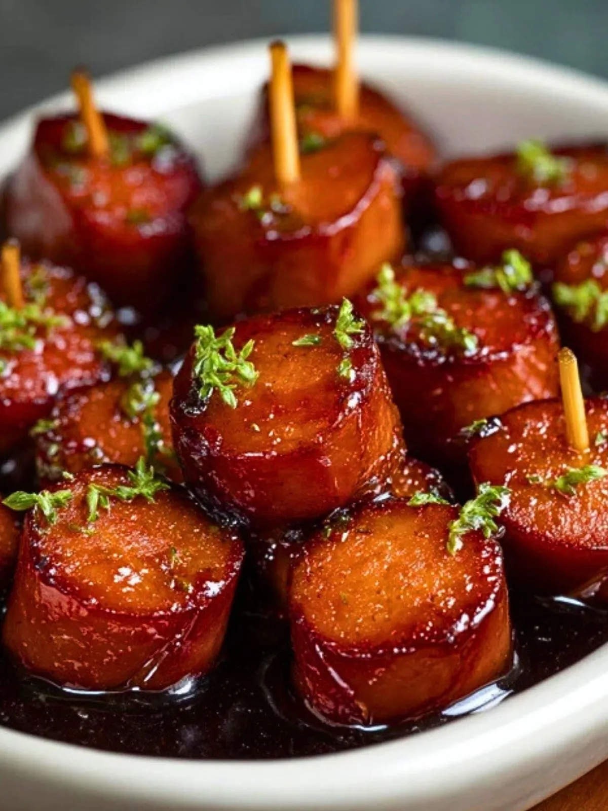 Parce qu’elles réunissent exactement ce que l’on aime grignoter en début de repas : quelque chose de simple, généreux et très gourmand. Le côté fumé ou savoureux des saucisses est enveloppé dans une sauce caramélisée au bon goût de sucre brut, de miel et de soja, avec une petite pointe acidulée qui équilibre le tout. Visuellement, ces bouchées brillantes donnent instantanément envie, et elles se mangent aussi bien chaudes que tièdes, ce qui en fait un allié parfait des buffets et apéros entre amis.