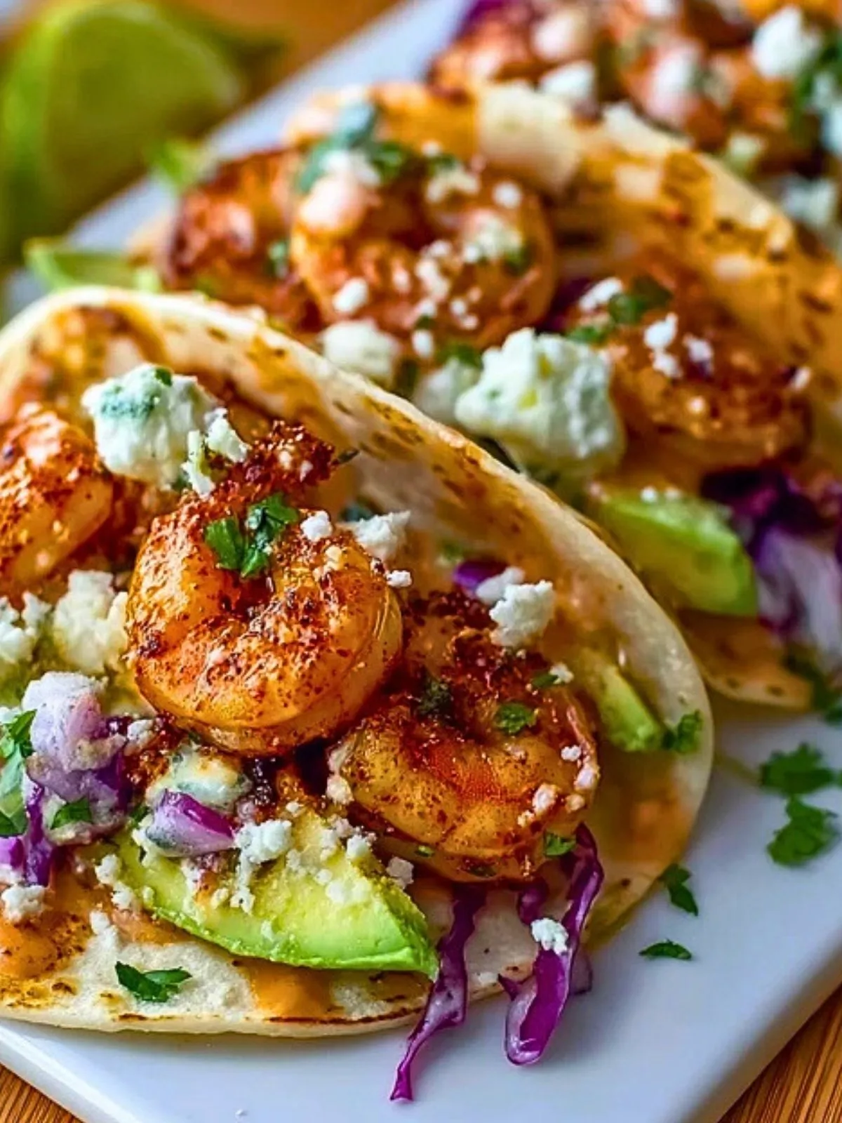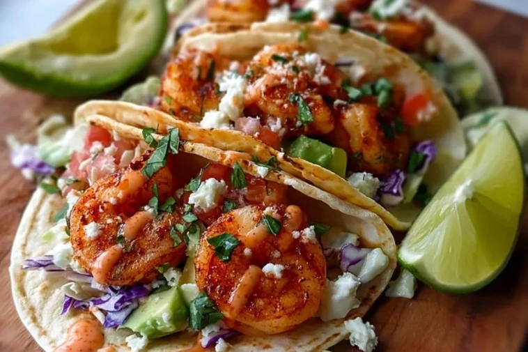 Ces tacos de crevettes savoureux marient des crevettes juteuses saisies aux épices, une garniture fraîche et croquante et une sauce crémeuse au citron vert pour un dîner ensoleillé, rapide à préparer et plein de saveurs.