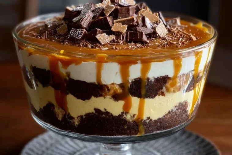 Le trifle au cheesecake au caramel salé et brownie est un dessert spectaculaire qui superpose des couches généreuses de brownie moelleux, de crème façon cheesecake et de caramel coulant. Présenté dans un grand plat ou dans des verrines, il séduit immédiatement par son jeu de textures et son allure très gourmande.